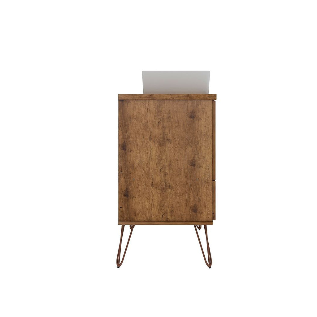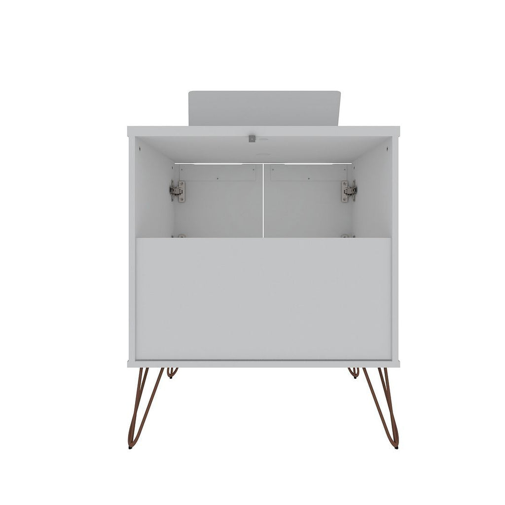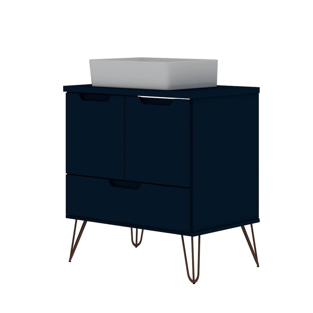 Refresh your bathroom or powder room space with the Rockefeller vanity that offers storage and style all at once. Beautiful splayed metal legs and detailed cut-out cabinet doors are seamless and versatile, easily blending with any interior design. Cabinet doors conceal shelving space to help arrange personal items, cleaning supplies, and more, also include a lower drawer for extra storage.